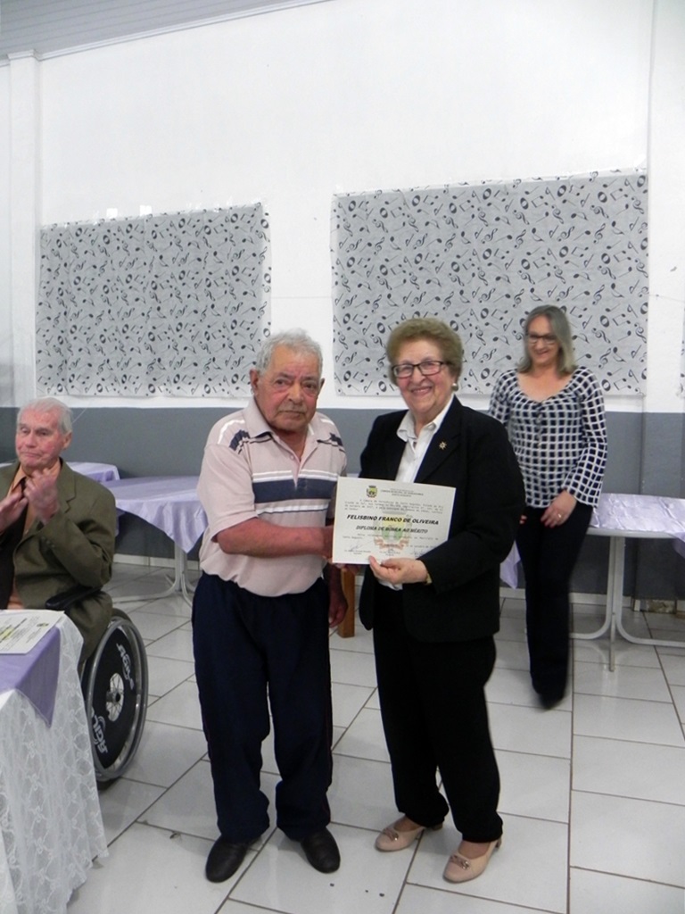 A Presidente do Conselho Municipal do Idoso, senhora Maria Dinora de Moura, entregando o certificado ao senhor Felisbino Franco de Oliveira